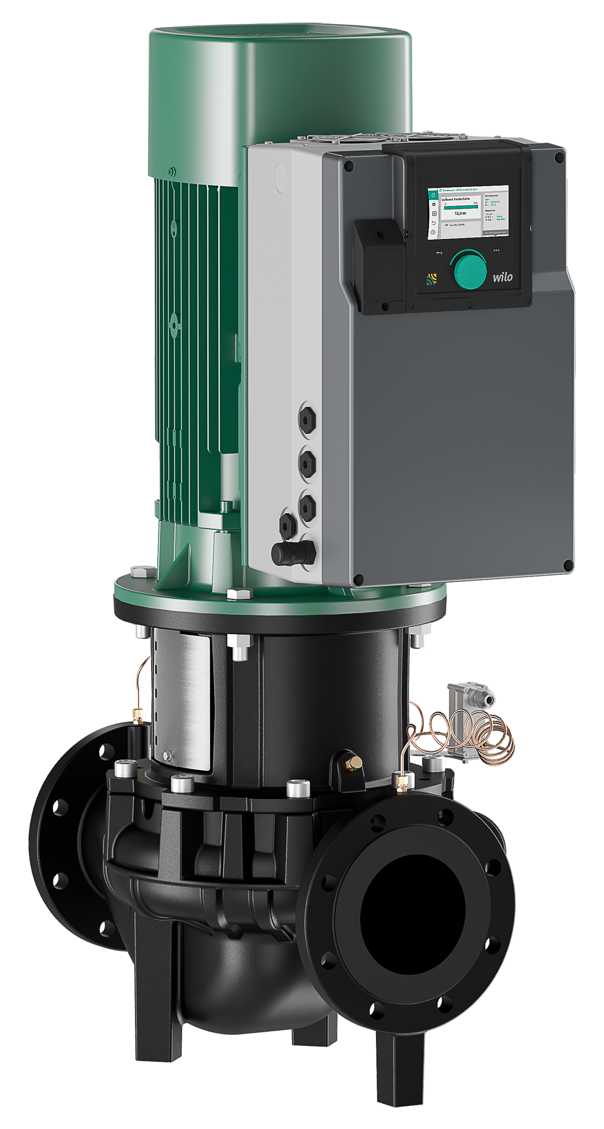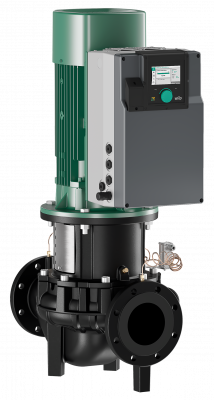 Högeffektiv inline-pump med EC-motor och elektronisk kapacitetsanpassning i konstruktion med torr motor. Utförande som enstegs centrifugalpump med flänsanslutning och mekanisk tätning.