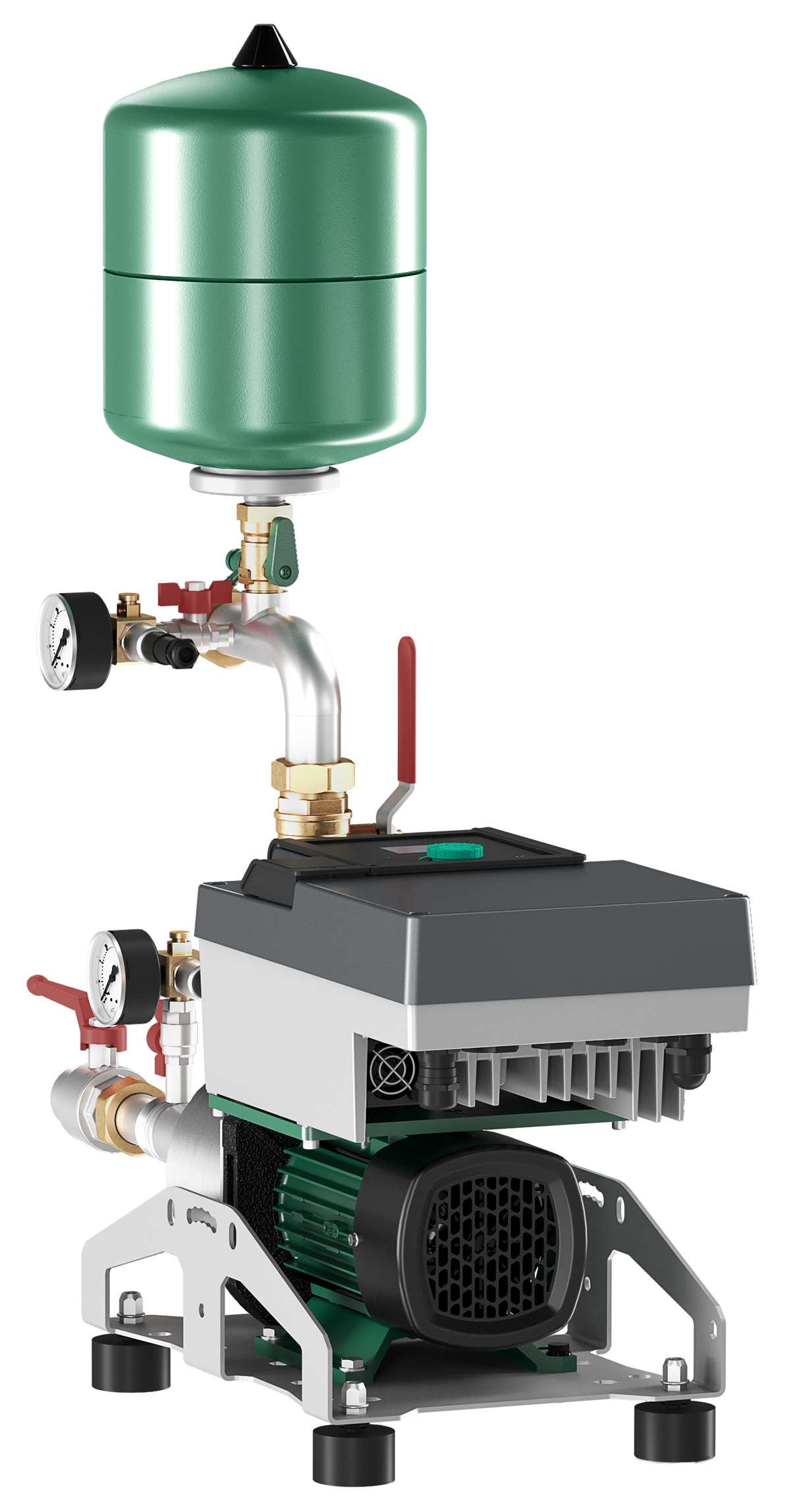 - Membrantryckkärl: 8 l/PN 10 på utloppssida med butylgummi-membran, fullständigt säker enligt livsmedelsföreskriften; i test- och inspektionssyfte, med avstängningskulventil samt tömning och flödesarmatur enligt DIN 4807
